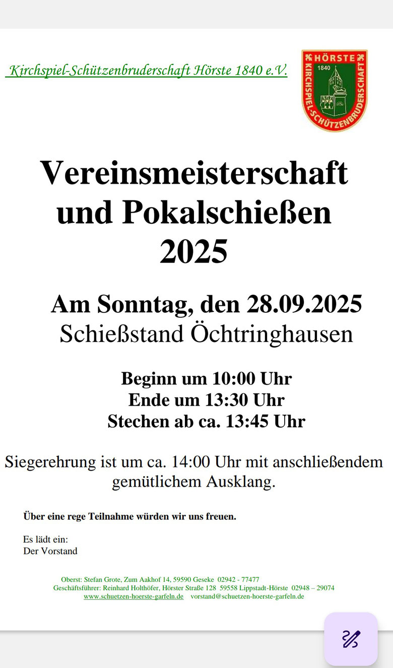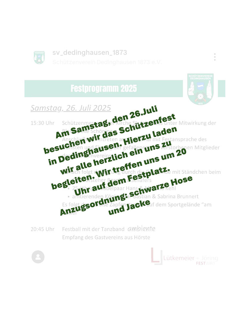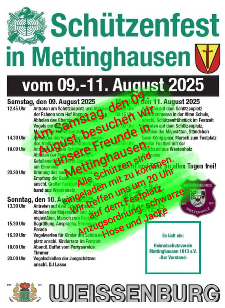 Am Samstag, den 24. Mai besuchen wir das Schützenfest in Mönninghausen. Alle Schützen sind herzlich eingeladen. Wir treffen uns um 20 Uhr an der Bierbude auf dem Festplatz in Mönninghausen.